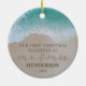 Anpassningsbar 1:a jultoman som nylyweds-prydnadsföremål med en tropisk sandskam, turkosa blått hav, det söta ordspråket "Vår första jultoma tillsammans som mr Mr. Och Mrs." skriver delvis i sanden, din familj namn och året.