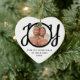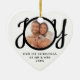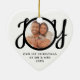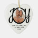 Den här vänliga, festliga, hjärtformade första julen som herr och fru fotokeramiska prydnadsföremål dekoreras med ord "JOY" i snyggtens svarta manustypografi. Enkelt anpassade.
