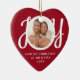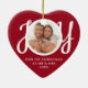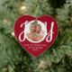 Denna vackra, framsynta, rödhjärtformade första jul som fotokeramiska prydnadsföremål dekoreras med ord "JOY" i snyggt, vit manustypografi. Enkelt anpassade.
