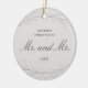 Gifte du dig i år? Lägg till ett minne i träd med denna viktiga keramiska prydnadsprodukt med två enkla hand plockade-blyertspennor skissade med löv med ord, "Vår första jul som Mr. och Mr." tillsammans med ditt bröllop över en neutralt grått bakgrund. Baksidan har ditt favoritfoto. Detta prydnadsföremål ger också en underbar gåva till ett homosexuellt par under deras första jul.