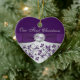 Denna keramiska hjärtformade prydnadssubstans i lila och silver grått blommigt har ett tryckt lila- band och båge med ett silver tryckt FAUX-präglat utseende eller medaljon på det. Det skulle göra en trevlig keepy av din speciella dag, eller en underbar gåva till nylingarna, eller ändra texten och ge som gåvor till dina bröllopsfester eller till speciella som favörer. Om du behöver hjälp med att anpassa det här eller om du vill ha något ändrat kan du skicka e-post till niteowlstudio@gmail.com.