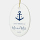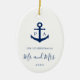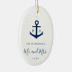 Gifte du dig i år? Lägg till ett minne i träd med denna bröllop-keepéprydnad som innehåller ett ankare med ditt monogram på båda sidor om ord, "Vår första jul som Mr. och Mrs." och året i marinblått över en vit bakgrund. Baksidan har ditt favoritfoto. Detta prydnadsföremål ger också en underbar gåva till ett nygift par inför deras första jul.