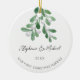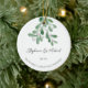 Fira din första jul som ett gift par med den här snyggten fotokeramiskt prydnadsämne. Den är dekorerad med vattenfärgsmistletoe och elegantens skripttypografi. Anpassade med namn, datum och foto. Använda Verktyg i Design om du vill ändra texten storlekt, stil eller färg. Ursprunglig vattenfärg © Michele Davies.