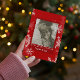 En underbar, modern helgdag-kortdesign med en snygg röd bakgrund med intrikat vitt snöflingor. Med det här anpassadet kan du lägga till ett familjefoto och texten "Vår första jul" i ett flytande kursivt skript, tillsammans med familjen namn och året för en personlig beröring. Perfekt för nyfödda att fira sin första jul tillsammans, detta keepsakskort är ett hjärtligt sätt att hedra minnet av deras första julhelg som gifta par. Det är en idealisk gåva eller hälsning för säsongen, som ger tillfälle värme och glädje.