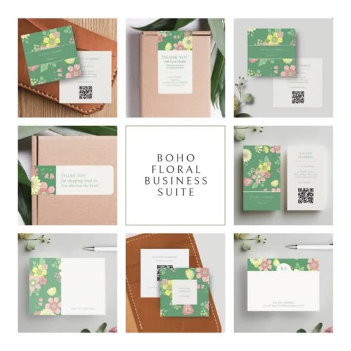 Dessa två blommigtar i marknadsföring-kylskåpet har en contemporary av typsnitt i muterad grönt mot en mjuk elfenbensbakgrund. Utformningen omfattar namn, yrke, webbplats och innehållsdetaljer.