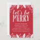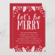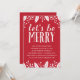 En festlig röd och vit julfestinladan. Frasen "Låt oss vara glada" är skriven med rolig, rustik typografi, med bär och järnekblad som ramar in inbjudan.