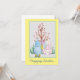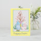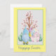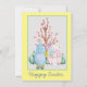 Cute Vattencolor tomte stil gnome med söt Vår bouquet av blommor, ett äggformat hem, blommande träd och baksida av pastellgult med anpassadet "Glad påsk".