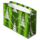 En färgfull julklapp i grönt med ett mönster av vitt, modernt Julgranar och det festliga hälsningen av "Be Merry", allt på en sjudande grönt.