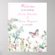 Söt bröllop välkomstskylt med vilda blommor i rosa och söta fjärilar. Perfekt för vår eller sommar bröllop. Ord kan ändras till kostym med dina egna uppgifter eller krav