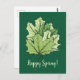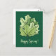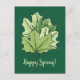 Vår-vykort med ett grönt-format lämnar digitalkonst med en dekorativ illustration av vår löv över mörk grönt speglad bakgrund och anpassadet "Lycklig Vår!".