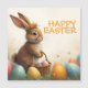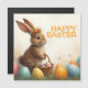 En söt Påskhare med en blomma i krona sitter lovande i färgstarka Påskägg. Han har en liten korgvide basket med färgade ägg i tassar. Scenen omges av ömtåligt vår blommor och varmt ljus. Inskriptionen "Glad påsk" lyser ovanför bunny i helig orange - en varm hälsning som fångar vår-festivalens ljushet och glädje.