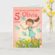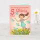Födelsedagskort i persiko- och akvarieform med en tjej med mörk hår från brunn. Anpassa med din information. Kortet säger: "Vår käraste barndotter Olivia 5 idag. Inuti: Grattis på födelsedagen. Roligt-kort designat av Sarah Trett. www.sarahtrett.com för www.mylittleeden.com com.au com.au