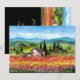 Tuscanien landskap,färgglad,livlig,uttrycksfull skönhet av italienska landsbygden, röda vallmofält,vacker sommarflora i ljust grön,gul,brun,blå,vit färg,ängar,blomsterfält,cypress- och olivträd, rustikt gammalt bondgård under blå himmel och vita moln .Akryl på duk .