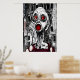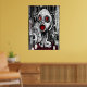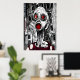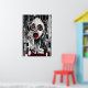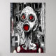 En svart, vit och röd konst pf en sjuk och skrämmande människa med rött öga och mun med byggnad i bakgrunden. Det här är en AI-skapad konst.