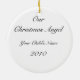 "Vår julängel" pryds med anpassade baby namn och dejtar på baksidan och vintage julängelbilden på framsidan som kan bytas ut mot ditt barns foto eller användas som det är.