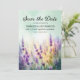 Vacker vår/sommar bröllop Spara datum-kort med lila lavendelblommor. Personlig med din foto på baksidan. Köp tryckta exemplar eller beställ digitalt för att dela med vänner och familj via e-post eller på dina sociala medier.