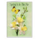 Färsk grönt texturerad bakgrund med gult butterfly, Forsythia gren och Daddodils i vitt och gult. Texten säger att Vår ligger i Luft. Inomverterade och anpassade hälsning och stängningsområden. Matchande porto är tillgängligt.