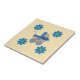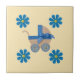 Handklippta persikor med baby med blå buske och blått band och limmade blå knappar på hjul, ljusa gulter på keramiska foto Tile för köks- och hemmadekoration. *Varje sak som du ser på produkterna tillverkas för hand, men du måste veta att du får ett foto!