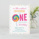 Den här söta födelsedagsfesten har ett färgat vattenfärgslollipop-godis med dekorativa sprinkles gräns. Anpassa födelsedagsfesten inbjudan genom att lägga till information om namn, ålder och party.