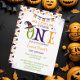 Den här roligten och den annalkande Halloween-temade inbjudan. personlig Halloween 1-födelsedagsinbjudan ( Lägg till din anpassning: Party Datum, Tid, Plats och OSA Info)