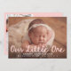 Välkomna din nyaste ankomst med det här ljuva och moderna baby-fotofödelsemeddelandet med "Vår lilla en" i mjuk handskript för rosa. Bilden på ditt baby-vågrät står i fokus för framsidan, där namn och födelsedetaljer elegant visas i ren, vit text nedan. Kortets baksida innehåller ett foto av lodrät och ett anpassade tackmeddelande som gör att du kan din glädje och tacksamhet med nära och kära. En perfekt för flicka och ett vackert sätt att fira detta värdefulla ögonblick.