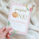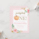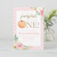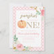 Vår lilla pumpa födelsedag i inbjudan med vattenfärgspumpa, rosa blommor och pastel rosa plaid och guld glitter text.