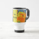 Tillsätt en spricka av färg och lite humor till morgonteet eller kaffet med den här resemuggen med en ljus orange och gult kan lida. Denna blomma besöks av ett stort bin som omges av det skårade mönster i denna stora blomma. Blomman kan gå i mitten av den muterade blåa vatten- och grönten-folien. Blomman visas på båda sidor om morgonen pendla mugg tillsammans med en mittbanderoll i orange och gult tillsammans med "Bee Lycklig". All text kan anpassas.