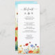 Bjud in din bröllopsmottagning med naturens charm med vår Vår Meadow Wildblommor Anpassade Menu. Den här ändringsmenyn innehåller en banbrytande bild av en vår-ängsskugga som är försedd med en skarp mängd vilda blommor. Vattenfärgsillustrationen fångar på ett vackert sätt naturens skönhet och ger en bildbakgrund för dina kulinariska detaljer. Den dominerande paletten i färg omfattar bedövande gula blommor som utstrålar värme och glädje, som sömlöst övergår till en kaskad av röda orangar blomning, och slutligen ett ömtåligt blåa blommor som tillför en gnutta lugn. Om du vill anpassa den här menyn ytterligare klickar du på länken "anpassa ytterligare" och använder verktyg för att justera mallen enligt dina inställningar.
