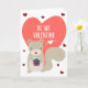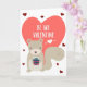 Alla hjärtans dag kort med en söt tecknad ekorre som håller en present med texten "Var min Alla hjärtans dag" över ett stort rosa hjärta omgivet av små röda hjärtan.