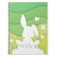 Cute tecknad papper påskhare på gräs, blommor, fjäril och bin, grönt gult vår landskap, påsk helgdagar kanin