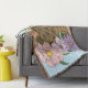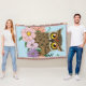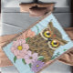Cute Little bruna uggla sitta bland pastellpersikor, rosa och lila Vår blommor i en ljusblå bakgrund