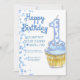 En grattis på födelsedageninbjudan som presenterar blåttpolka dots.