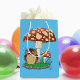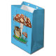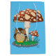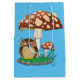 Grumpy Little uggla gömmer under ett svamprum som ett paraply från regnet.