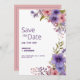 Sommarlavender rosa blommigt ram Bröllop spara datum inbjudan. Elegant, bröllopsinbjudningar för vår blommigt med dina bröllop-detaljer som är ramade av vattenfärgslavender, löv för rosa och grönt. Anpassa de färgstarka bröllopsinbjudningarna för blommigt genom att lägga till ditt namn och bröllop-uppgifter. Sommarens bröllopsinbjudan går tillbaka till en solid rosa bakgrund. Perfekt för vår och sommar-bröllop och trädgårdsbröllop. Alla designer skrivs ut.
