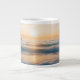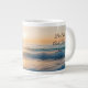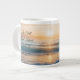 Specialkaffe mugg med soluppgång över havet och "Var stilla och veta att jag är Gud" skrev på det. AI genererade.