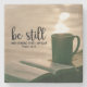 Den inspirerande skriptsten underlägg skildrar en fredlig scen av en öppen bibel sitta bredvid en kopp av ångande hett dryck, kanske kaffe eller te, på en räv som förbiser vatten. Bible Verse Psalm 46:10: "Var stilla och veta att jag är Gud." *