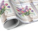En livfull bukett av tulpaner och syrener är vackert arrangerad i en spräcklig keramikkruka, placerad mot en ljus fönsteröppning som skapar en mjuk bokeh-effekt