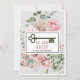 Snygg inbjudan till blommigtens hemmavärmarfest! Utformningen av rosa blommigt framtill markeras med ett grönt skelett på nyckel och det stora teckensnittet som lyder "Be vår gäst" och ett mindre teckensnitt under det som lyder "På vår Ny adress". Väntesidan innehåller fler rosa blommor med ett annat skelett nyckel, ett stort typsnitt som bjuder in mottagaren till en "Housework Party" och en "fill in"-mall så att du enkelt kan skriva i dina uppgifter när du har gjort dina planer! Underbar för de planerare i party som vill köpa inbjudan i förtid!