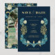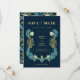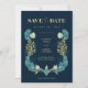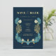 Denna vackra "Spara datum" är säker på att göra intryck! Designen har ett modernt vintage William Morris inspirerat blommotiv i blått och gult, orden "Spara datum" i stilrena typsnitt med en båge för foto på baksidan.