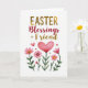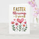 Det här kortet har en ljus säsongsbetonad illustration som kombinerar en vänlig hälsning med en trädgårdsscen. Den övre halvan består mestadels av text, med ett firande budskap i metalliskt guld och varmt karmosinröd bokstavstyp längs överkanten. Under orden fyller en blomsterbukett den nedre halvan med mjuka rosa och djupare röda nyanser på vit bakgrund. En stor hjärtformad blomma sitter i mitten, med kronbladskanter som är mjukt sammanblandade för att förmedla en öm och tillgiven ton. Runt omkring den lutar sig mindre blommor med soliga gula mittpunkter mot varandra på tunna gröna stjälkar, som nära vänner som delar en tyst stund. Små rubinröda hjärtaccentuer sparkas mellan blomningarna, vilket förstärker känsl