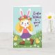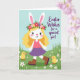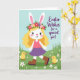 Det här kortet visar en vårscen med en upprätt kaninliknande figur, tecknad med långt, vågigt gyllene hår, mjuka vita öron, rosiga kinder, ljusa ögon och en liten hjärtformad näsa 🐰. En blomsterkrans i röda, rosa, gula och violetta blommor vilar på hennes huvud, och hennes milda leende och avspända kroppshållning antyder en vänlig och tillgiven stämning. Hon står lite till vänster om mitten iförd en korallrosa topp, en flytande lavendelskört och bruna stövlar, som om hon tar en paus för att dela en tyst stund utomhus. På höger sida syns ett kort meddelande i lila, kursiv stil, placerat mot den öppna himlen för enkel läsning. Rullande gröna kullar sträcker sig längs nederkanten, prickade med små vita stjärnliknande blommor som ser ut att ha strötts omkring av en lätt bris 🌷. Två luddiga