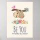 En poster med ett roande ordspråk: Vare sig du är i världen kommer du att anpassa dig. Designad med en illustration av en söt brun lutning som hänger upp och ned. Den här lustiga lilla killen håller fast vid en gren som har en liten rosa fågel på ena sidan av gren och en udle-stil bukett med rosor på andra sidan. Under dem finns en arrangemang av färgstarka, handdragna blommor. Den här vackra slätten har också rosa rosiga kinder och tre söta små hjärtan på rumpan.
