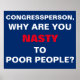 Text: kongressledamot, varför är du elak mot fattiga människor? Patriotisk röd och vit text på blå bakgrund. Varför är republikanerna så elaka för fattiga människor? Fråga vid nästa stadshus eller #resistencerecess-händelse. Motståndet fortsätter varje dag, med varje handling och varje protest.