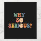 En lekfull och vismisk design med frasen "Varför så allvarlig?" i en mängd flerfärgade, leende typsnitt. Texten återges i ett dynamiskt och energiskt stil, vilket väcker en känsla av glädje och lättsinnighet.