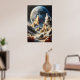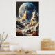 En varg i måne ligger i ett fantastiskt landskap av berg och glätterorber med snö-tak. Det stora, blå måne fyller himlar och kastar en eterisk glöd över scenen.