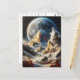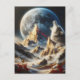 En varg i måne ligger i ett fantastiskt landskap av berg och glätterorber med snö-tak. Det stora, blå måne fyller himlar och kastar en eterisk glöd över scenen.