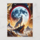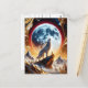 En vit varg står på en bergig topp, som hånar vid ett stort, blått måne med röd halo. Scenen ställs mot bakgrund av snöberg och en avlägsen skog.
