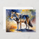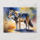 Söt vacker grått-varg som står i en avskiljning i en vattenfärgsmålning i en skog. Perfekt för natur och konst älskare och entusiaster.