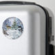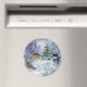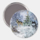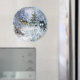 Den här runda kylmagneten har en vacker vinterscen med träd, vargar i vild och ett dekorerat Julgran som är täckt av snö.