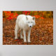 En stor vit varg med piercing blå ögon står på ett skonsamt sätt på höst löv säng. Riken , orangar och gulter av bakgrunden skapar en slående kontrast till dess ursprungliga päls. Vargens närvaro, lugn och makt väcker höstens anda.